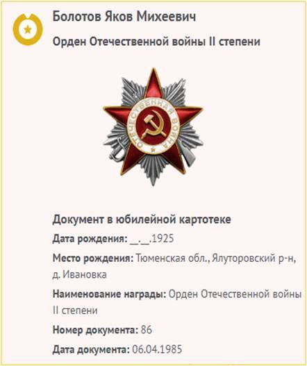 Шугур – село небольшое, поэтому каждый человек на виду. Есть у нас такие люди, про которых говорят: « Они достойно прожили свою жизнь». Таким является Яков Михеевич Болотов. Его уважают не только за порядочность, честность и доброту. В красивом селе Шугур в переулке Солнечном на горке у реки Юконды стоит его ухоженный домик. Здесь каждый год 9 мая собирались за праздничным столом его дети, внуки, правнуки, родственники, друзья, чтобы пожелать ветерану здоровья и благополучия. И в тесном кругу Яков Михеевич всегда вспоминал свои фронтовые дороги и своих фронтовых друзей.