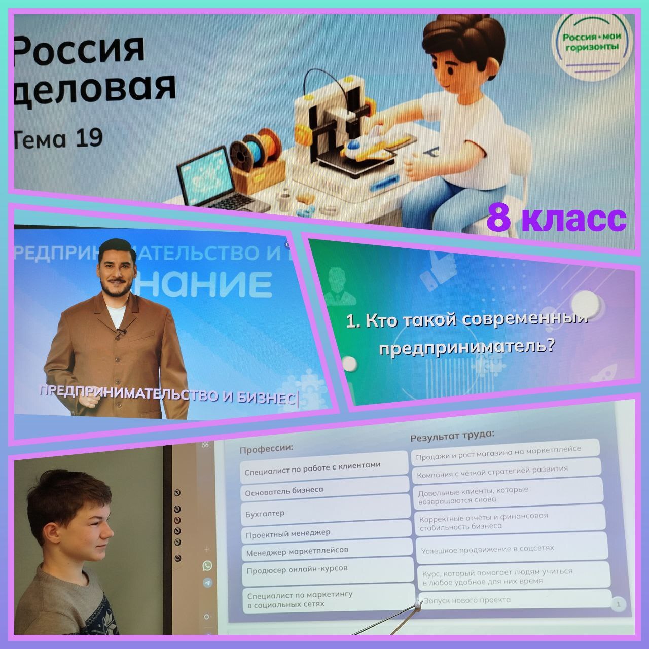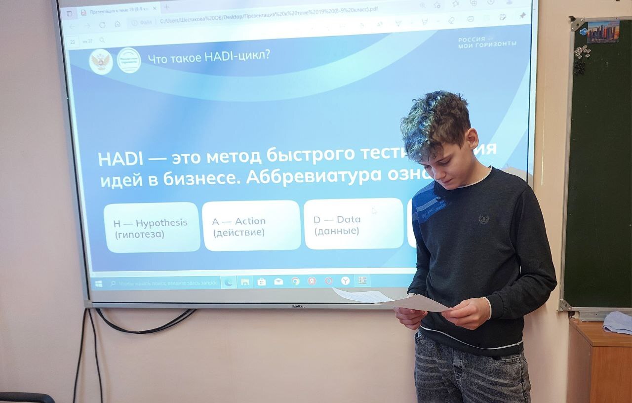 В рамках профориентационного курса «Россия – мои горизонты» 29 января 2026 года состоялось занятие «Россия деловая: предпринимательство и бизнес» Предпринимательство — это не только про бизнес, но и про способ мышления, умение принимать решения, работать с идеями и брать на себя ответственность за результат. Эти навыки сегодня важны в самых разных профессиональных сферах, независимо от того, планирует ли человек открывать своё дело. На занятии обучающиеся познакомились с основами предпринимательского мышления, попробовали разобраться, из каких элементов складывается бизнес, узнали, какие качества и навыки особенно важны для тех, кто работает в этой сфере.